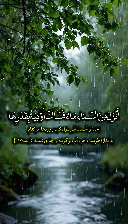 [خدا از آسمان آبی نازل کرد و رودها هرکدام به اندازۀ ظرفیت خود آب برگرفته و جاری شدند. (رعد/17)]